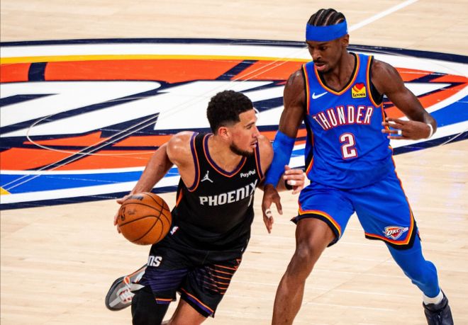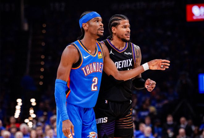 次节比赛,雷霆连续两节得分30+,限制太阳连续两节不足25分。太阳追到差13分,雷霆三巨头连续得分一波12-0攻势,已经拉开49-24领先优势。雷霆之后继续维持53-28领先优势,太阳冲击内线一波9-3攻势追分,杰伦冲击内线与霍姆格伦外线三分得分,雷霆再度拉开63-41领先优势。布克三分命中,亚历山大再得2分,雷霆单节30-24净胜6分,上半场结束雷霆扩大65-44领先太阳21分优势。前两节比赛,太阳三分24中7,布克13分、狄龙12分与格林10分;雷霆三分19中6,亚历山大15分、霍姆格伦16+7与杰伦11分6助攻。