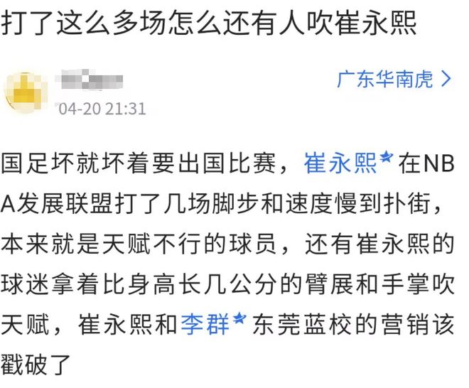 同时,也有一些广东球迷也坐不住了,发帖质疑崔永熙:好好去练稳定性,整天笑嘻嘻,还真以为自己实力媲美发展联盟球员领先国内球员呢,实力不行偶像包袱沉重。本来就是天赋不行的球员,还有崔永熙的球迷拿着比身高长几公分的臂展和手掌吹天赋,崔永熙和李群的东莞蓝校的营销该戳破了。