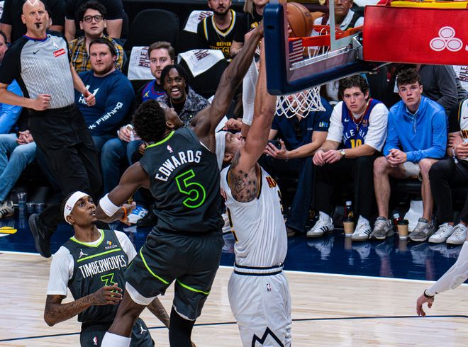次节比赛,掘金进攻火力大幅升级本场首次单节得分35+,且限制森林狼本场首次单节不足30分。穆雷持续得分,引领掘金逐步追到34-38落后森林狼,森林狼随后重新扩大7分优势。掘金一波7-0攻势追平比分,森林狼再度取得3分优势,琼斯三分追平。双方之后连续战平,穆雷单节轰下14分引领掘金单节39-29净胜10分,上半场结束掘金追到62-62持平森林狼。前两节比赛,约基奇6+6+7、穆雷17分与卡约10分;麦克丹尼尔斯12分、爱德华兹11+5与戈贝尔10+5。