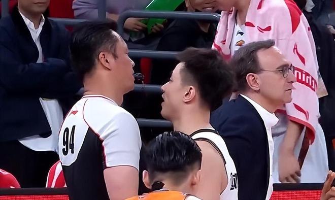 死球后赵继伟对裁判进行了严重抗议,手指裁判情绪有些激动,面对比自己还高半头的裁判进行了面对面的输出,94号裁判在尽量避免飞沫传播的同时也没有对有些上头的赵继伟客气,随后吹罚了赵继伟一次技术犯规。