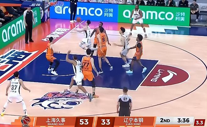 当时比赛第二节比赛打到3分半左右,赵继伟利用张陈治锋的掩护突破上篮却没有打进,双方随后拼抢篮板球出界,裁判吹罚了上海男篮球权。
