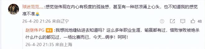 赛后赵继伟发文“呵呵”让大家有些误会,之后赵继伟解释表示:我想找地缝钻进去知道吗?这么多年职业生涯,输赢都有过,惜败惨败被绝杀什么什么的都见过,一场比赛而已,今天…俩字!呵呵!