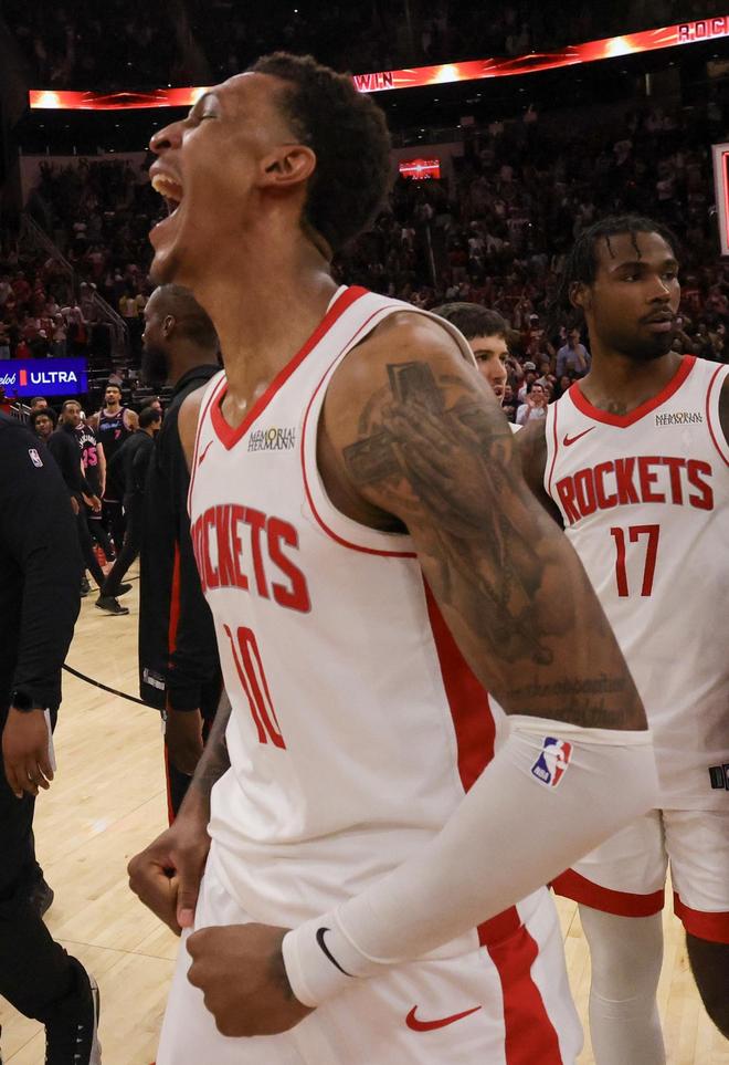 火箭队的内线四猛将——前锋泰特、阿门·汤普森、申京以及小史密斯一共摘下了17个前场篮板,帮助火箭队赢得了大量二次进攻机会。这其中除了小史密斯拿到了5个前场篮板之外,申京、阿门和泰特各抢下了4个前场篮板,尤其是老将泰特,9分钟就摘下了4个前场篮板,他在比赛当中相当拼。这也是为什么乌度卡教练宁愿用他也不用芬尼·史密斯的原因。