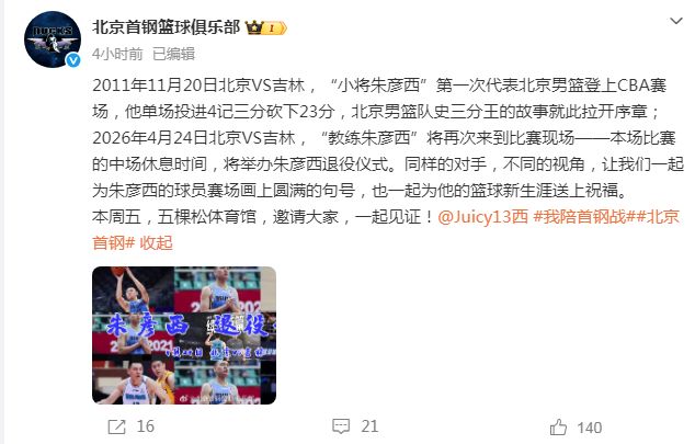 北京时间4月20日,朱彦西在2025年夏天退役结束球员生涯,如今北京男篮官宣将在本赛季的常规赛主场对阵吉林男篮的比赛,为朱彦西举办退役仪式,而他生涯首场比赛就是对阵吉林男篮。