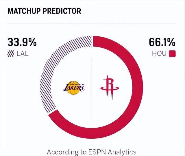 即便是湖人大比分2-0领先,美媒给出的火箭晋级概率依旧高达66.1%,湖人仅有33.9%;这种胜率预测,和系列赛战绩之间属实有点反常。