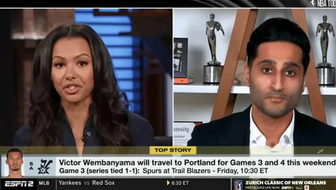 4月24日,知名记者Shams在节目中透露马刺球员文班亚马的恢复情况,他表示目前文班恢复良好,不仅会前往波特兰,也会参加G3和G4的比赛。