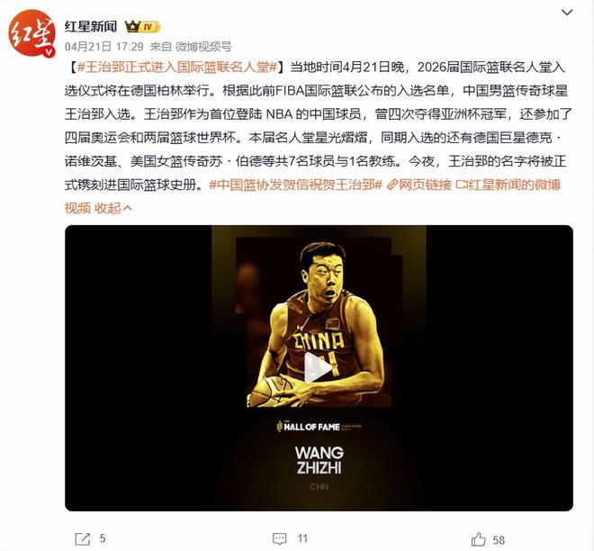 中国男篮球星王治郅,正式入选2026届国际篮联名人堂。