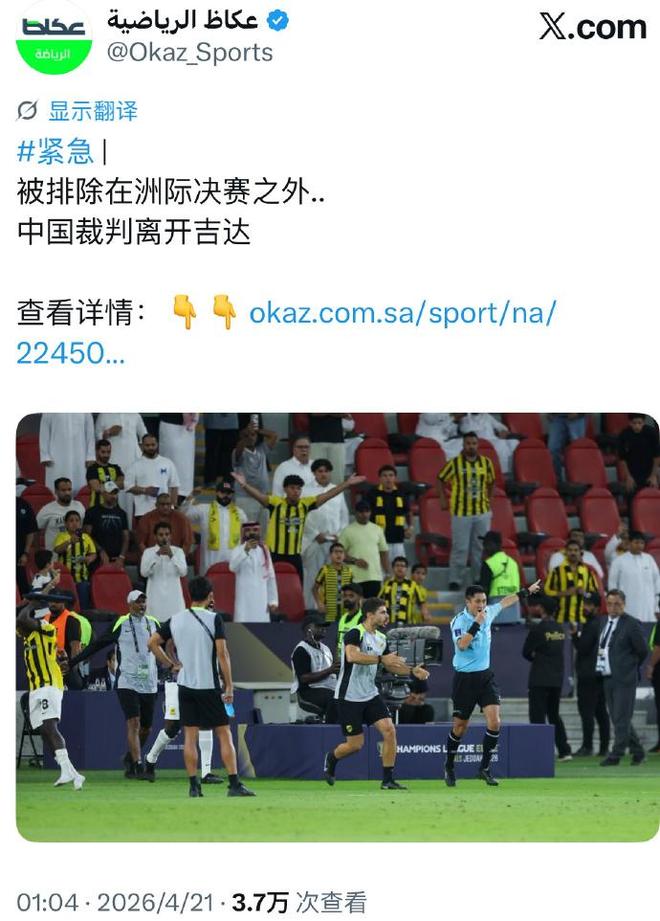 北京时间4月21日,有沙特媒体报道称,中国籍国际级裁判员因在主哨亚冠精英联赛1/4决赛沙特吉达联合对阵日本町田泽维亚比赛期间,出现了失误,而被亚足联取消了执法冠、亚军决赛的资格,还称马宁已经回国。北京青年报21日晚些时候经核实获悉,亚足联赛后很快就当场比赛几次争议判罚进行了评议,并认定马宁当场比赛的执法工作并无错漏判。目前马宁仍身在沙特吉达,待到半决赛第2场比赛町田泽维亚VS阿联酋迪拜青年国民比赛结束后,亚足联将于北京时间22日确定包括马宁在内的裁判员们是否离开吉达赛区。