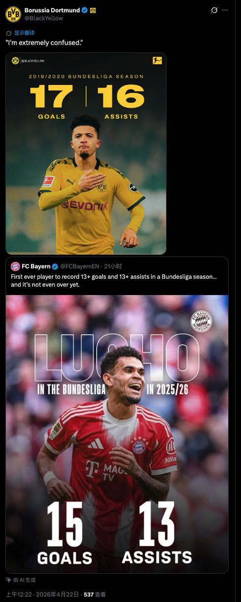 拜仁官方社交媒体晒出数据图,称路易斯-迪亚斯是首位单赛季德甲进球、助攻均达到13+的球员,多特蒙德官方摆出桑乔的数据指正。